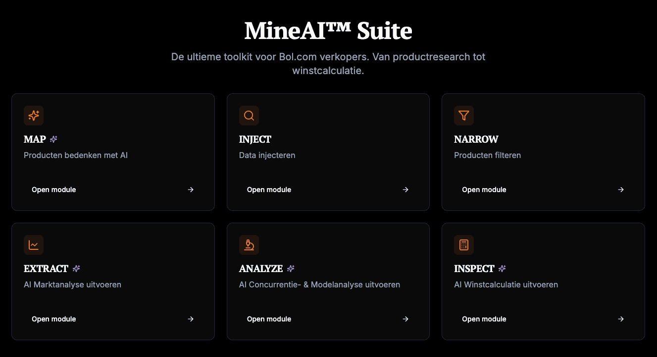 Toegang tot het MineAI™ Product Research Model en andere tools. Productvalidatie, marktanalyse en concurrentie-inzichten waarmee je slimmere keuzes maakt.