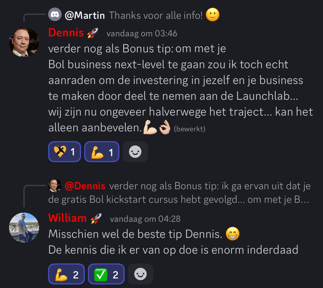 We hebben al eerder contact gehad met verschillende coaches en zijn erg tevreden over de kwaliteit van de trainingen en de beschikbaarheid van de coaches! We zouden ze zeker aanbevelen aan iedereen die een eigen Bol-bedrijf wil starten.
